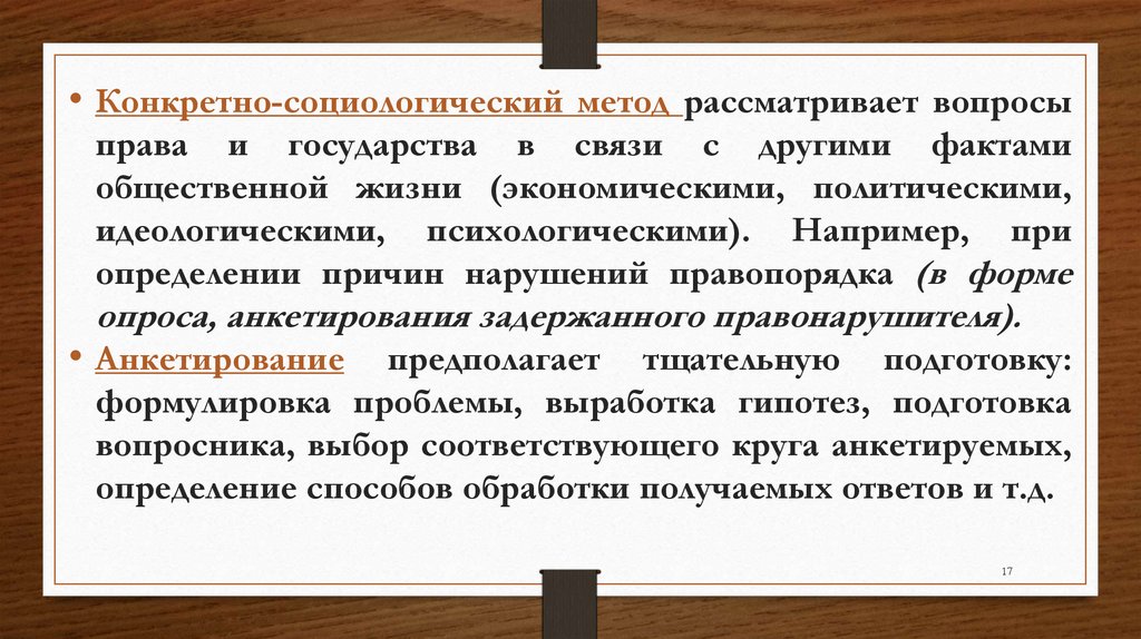 • Конкретно-социологический метод рассматривает вопросыправа и государства в связи с другими фактами