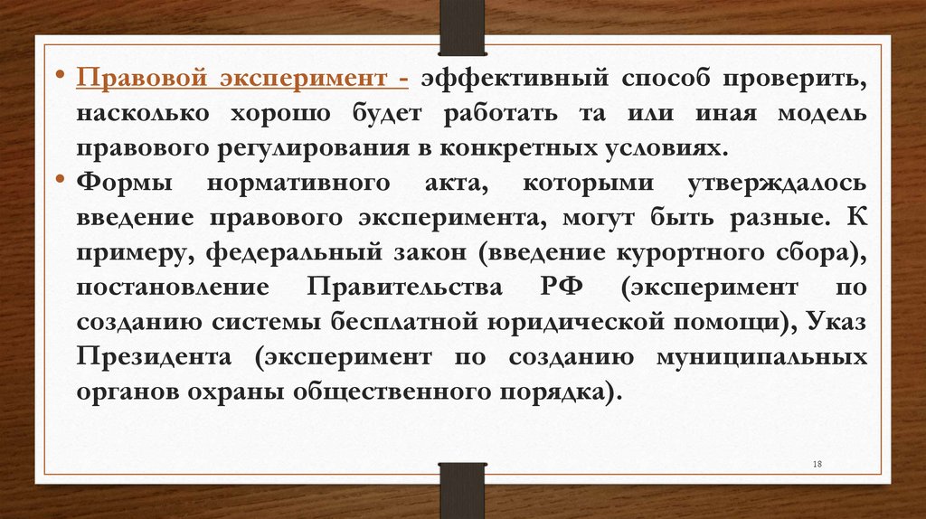 • Правовой эксперимент - эффективный способ проверить,насколько хорошо будет работать та или иная модель
