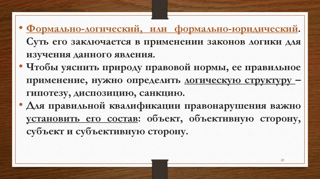 • Формально-логический, или формально-юридический.Суть его заключается в применении законов логики для