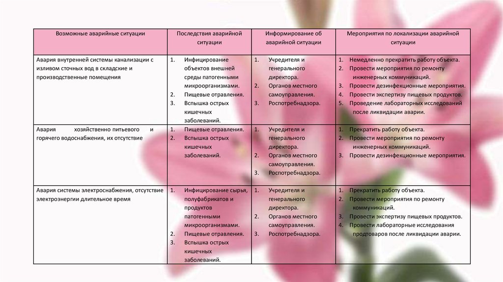 В ООО «Кафе-Лав» возможны следующие аварийные ситуации, связанные с остановкой производства,нарушениями технологических процессов, созданием угрозы санитарно-эпидемиологическому