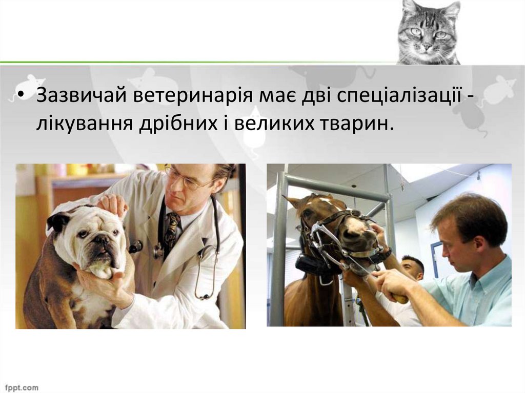 • Зазвичай ветеринарія має дві спеціалізації лікування дрібних і великих тварин.4. Де працює Ветеринар: