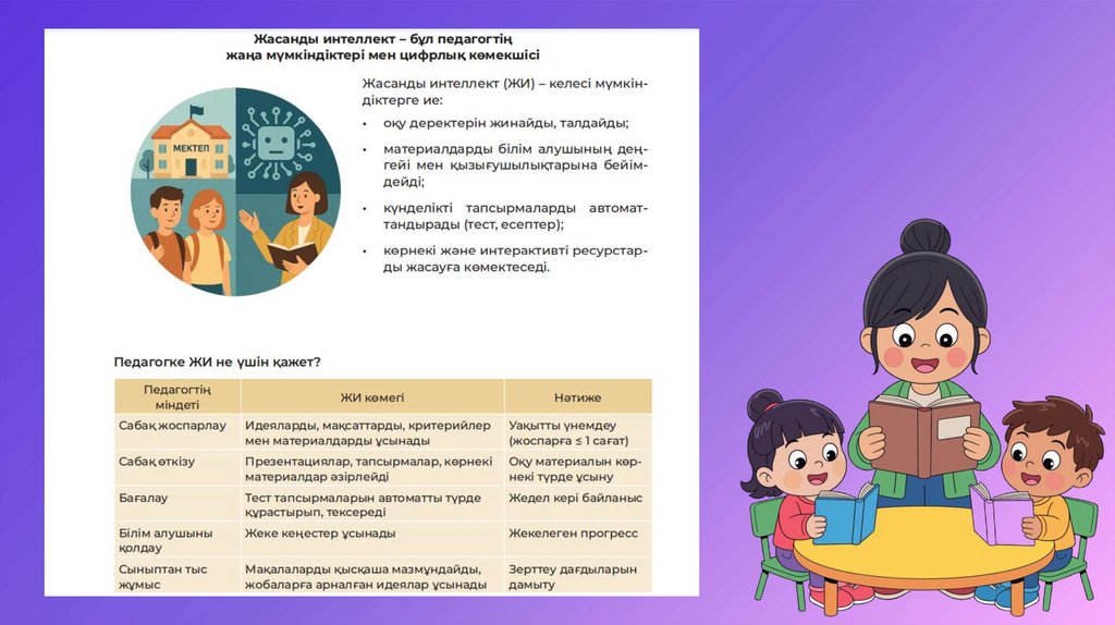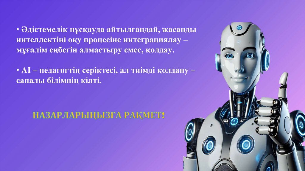 • Әдістемелік нұсқауда айтылғандай, жасандыинтеллектіні оқу процесіне интеграциялау –