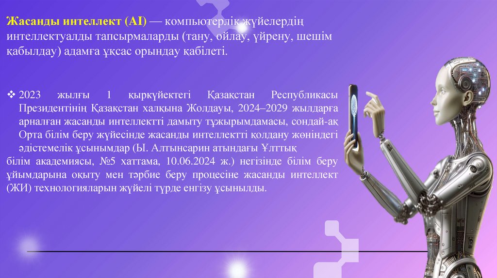 Жасанды интеллект (AI) — компьютерлік жүйелердіңинтеллектуалды тапсырмаларды (тану, ойлау, үйрену, шешім