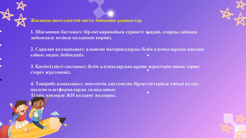 Жасанды интеллектіні енгізу бойынша ұсыныстар1. Шағыннан бастаңыз: бір-екі қарапайым сервисті таңдап, оларды сабаққа