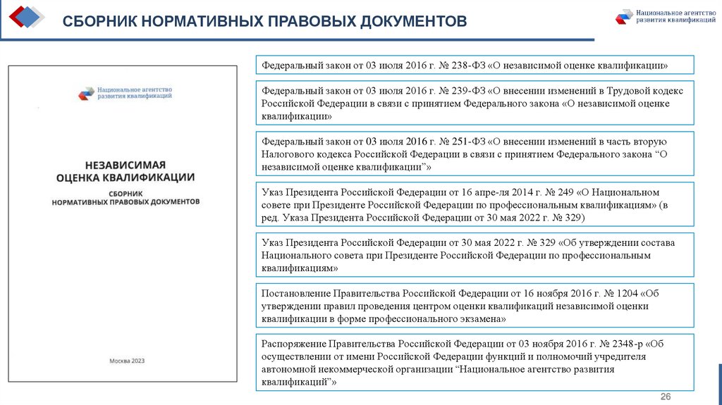 СБОРНИК НОРМАТИВНЫХ ПРАВОВЫХ ДОКУМЕНТОВФедеральный закон от 03 июля 2016 г. № 238-ФЗ «О независимой оценке квалификации»