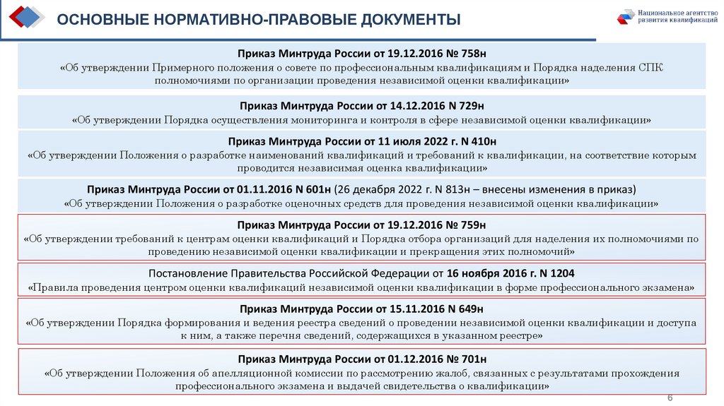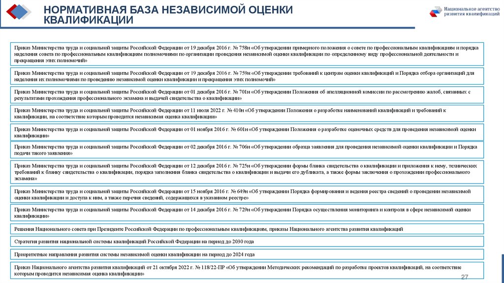 Решения Национального совета при Президенте Российской Федерации по профессиональным квалификациям, приказы Национального агентства развития квалификаций