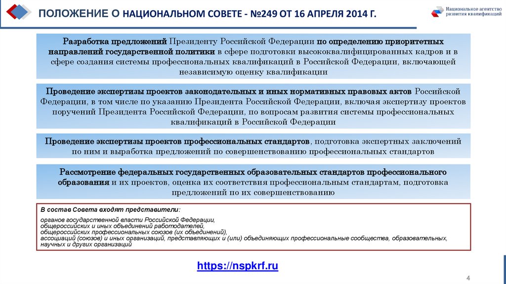 ПОЛОЖЕНИЕ О НАЦИОНАЛЬНОМ СОВЕТЕ - №249 ОТ 16 АПРЕЛЯ 2014 Г.Разработка предложений Президенту Российской Федерации по определению приоритетных