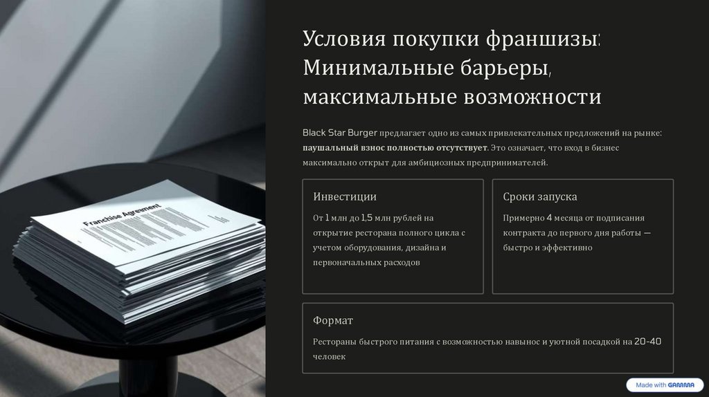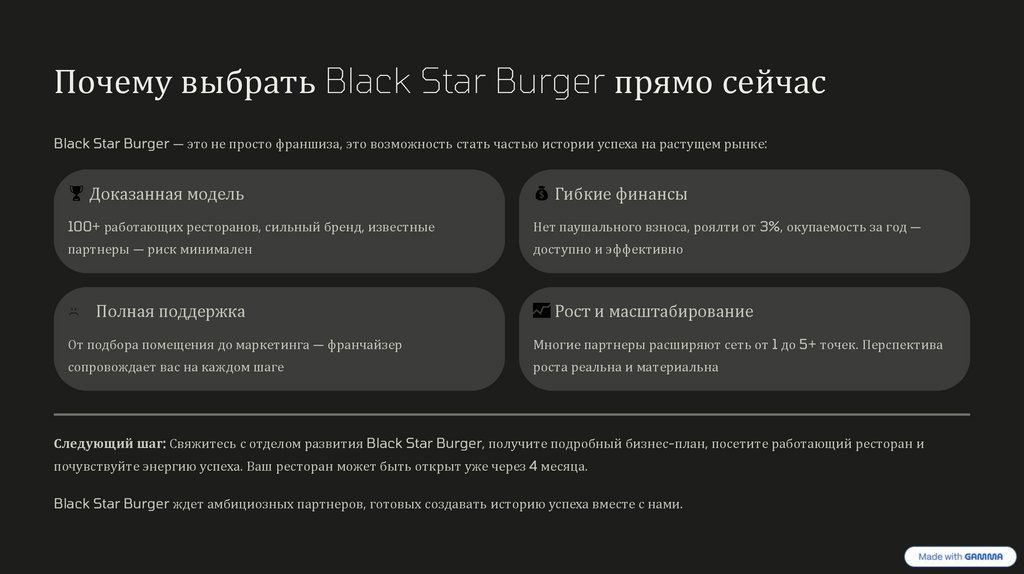Почему выбрать Black Star Burger прямо сейчасBlack Star Burger — это не просто франшиза, это возможность стать частью истории успеха на растущем рынке: