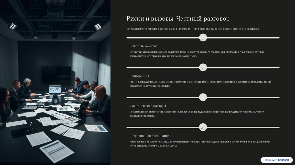 Риски и вызовы: Честный разговорЧестный партнер говорит о рисках. Black Star Burger — отличный выбор, но как и любой бизнес, имеет вызовы: