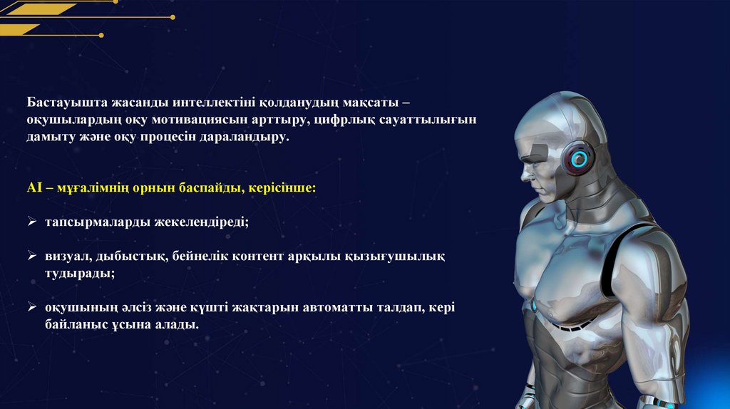 Бастауышта жасанды интеллектіні қолданудың мақсаты –оқушылардың оқу мотивациясын арттыру, цифрлық сауаттылығын