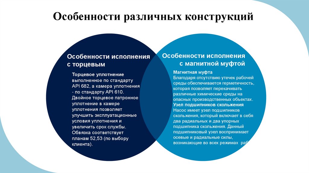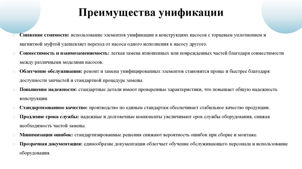 Преимущества унификацииo Снижение стоимости: использование элементов унификации в конструкциях насосов с торцевым уплотнением и