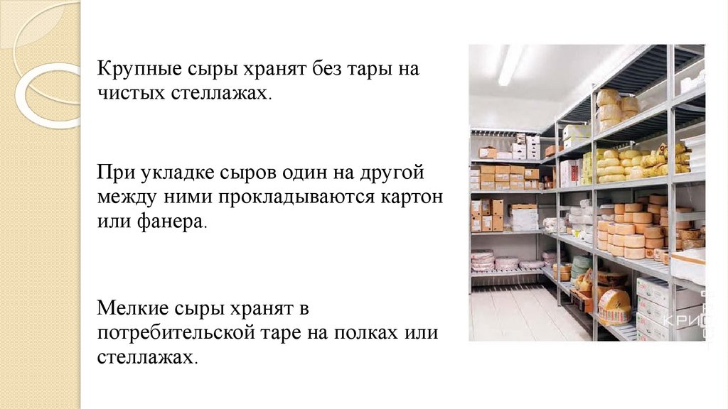 Крупные сыры хранят без тары начистых стеллажах.