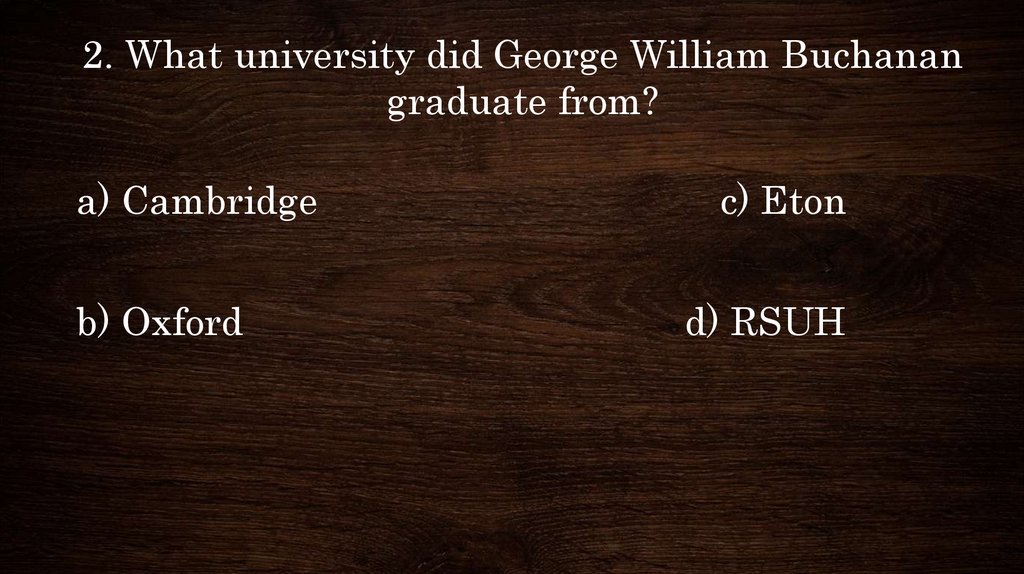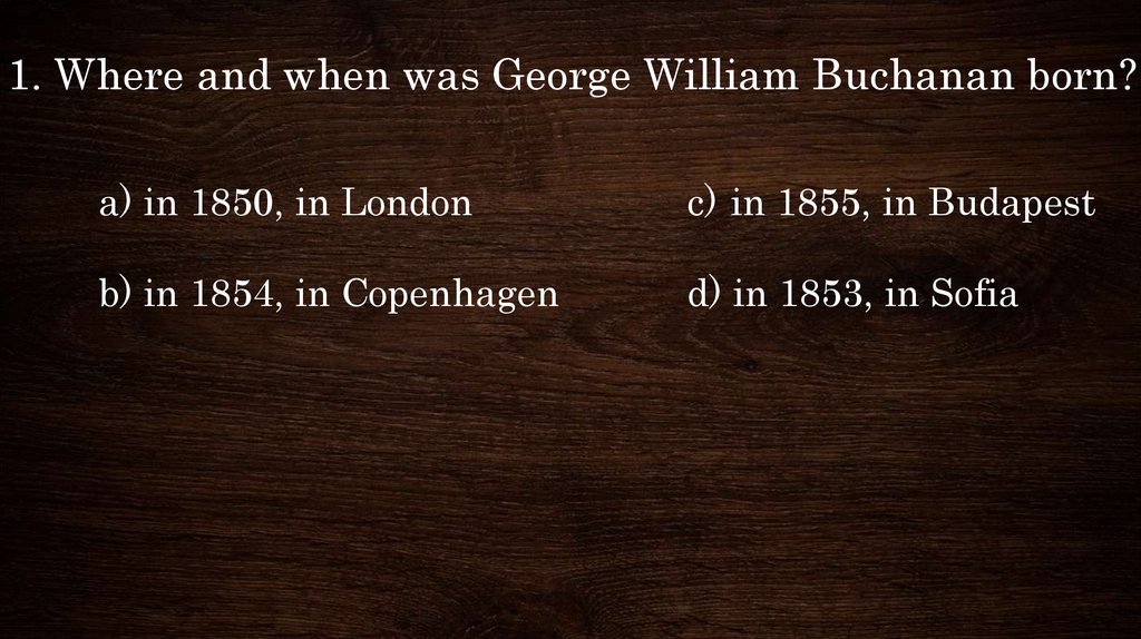 1. Where and when was George William Buchanan born?a) in 1850, in London