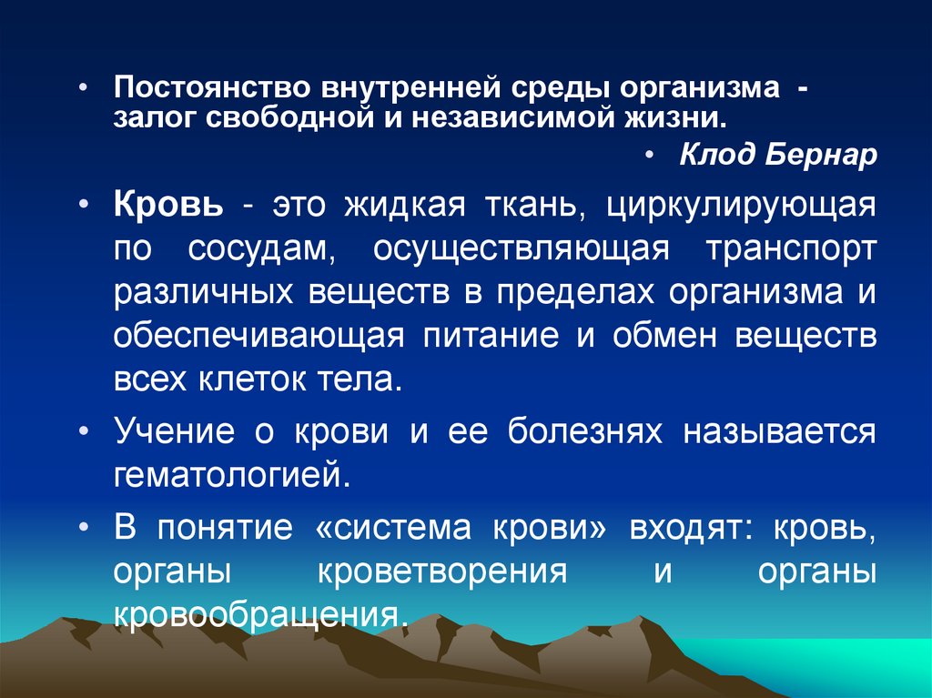 • Постоянство внутренней среды организма залог свободной и независимой жизни.• Клод Бернар