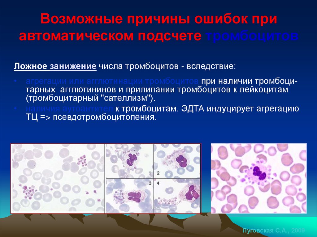 ЭДТА-зависимый "тромбоцитарный сателлизм".тромбоциты связываются и образуют розетки вокруг