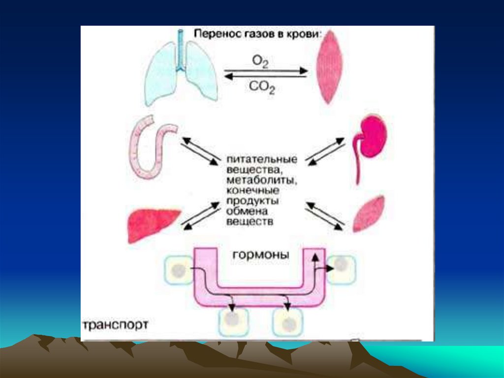 • Кровь переносит газы — кислород идиоксид углерода, а также питательные