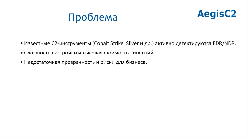 Проблема• Известные C2-инструменты (Cobalt Strike, Sliver и др.) активно детектируются EDR/NDR.