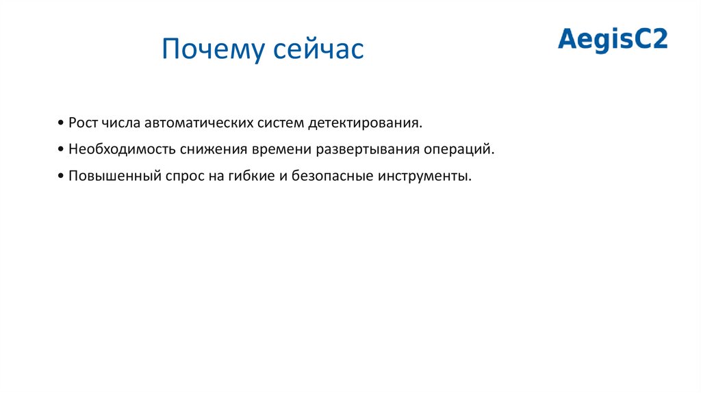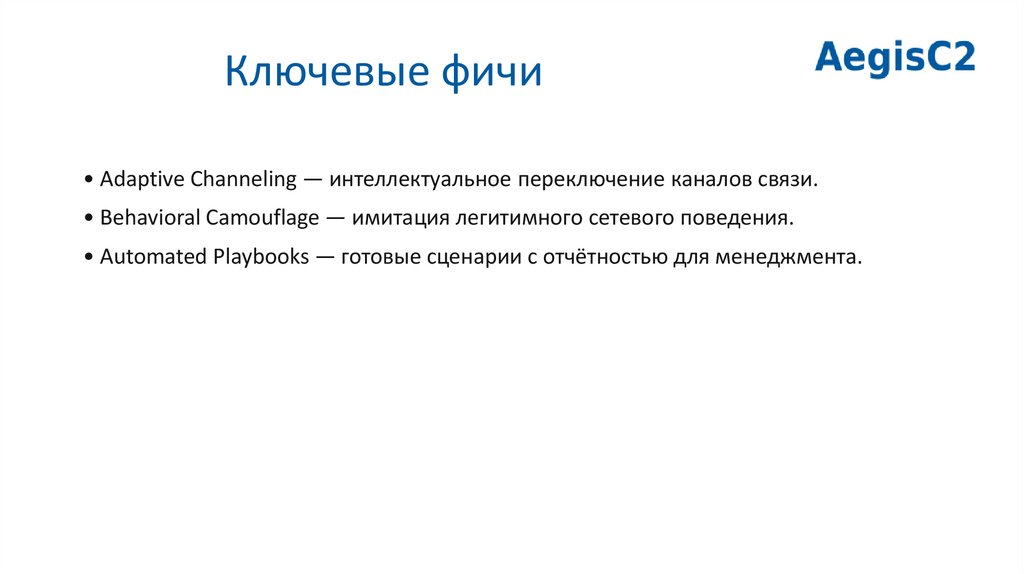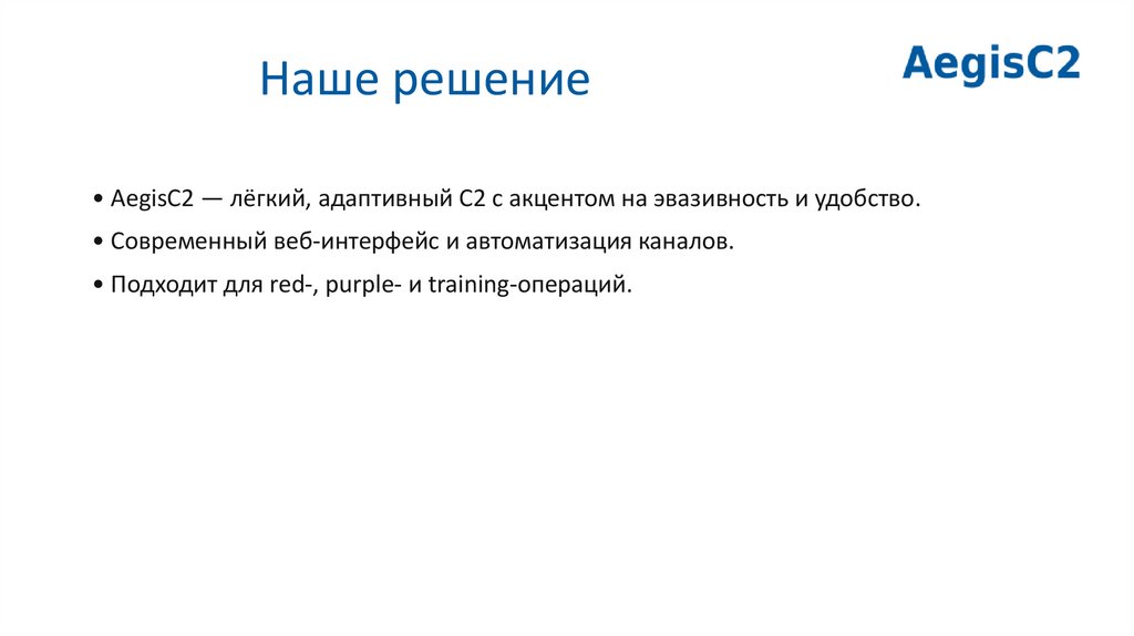Наше решение• AegisC2 — лёгкий, адаптивный C2 с акцентом на эвазивность и удобство.