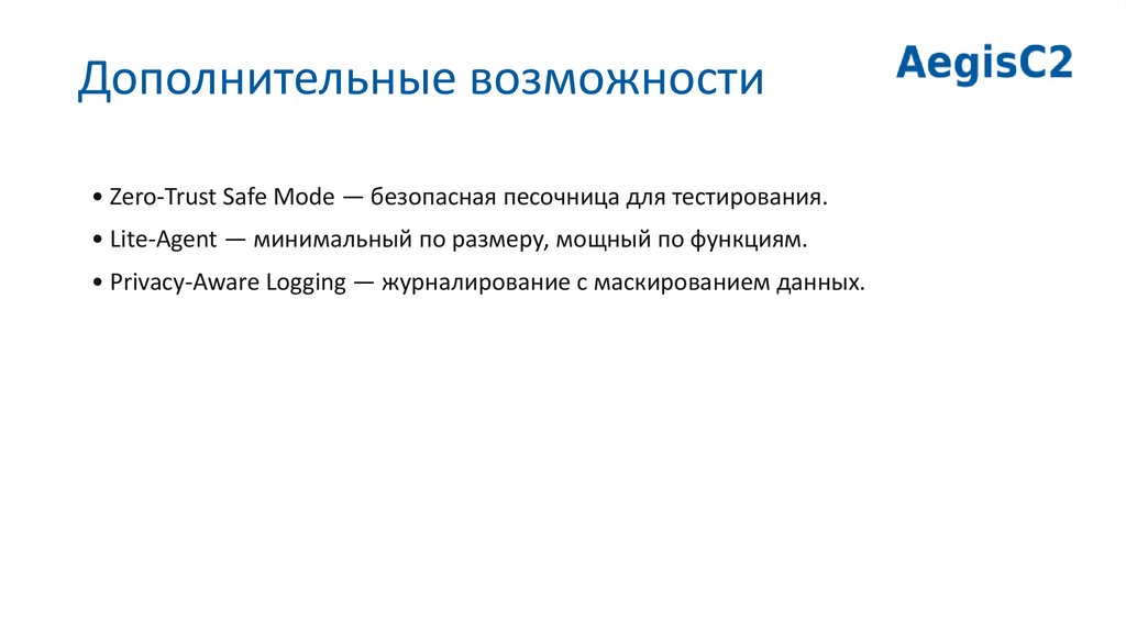 Дополнительные возможности• Zero-Trust Safe Mode — безопасная песочница для тестирования.