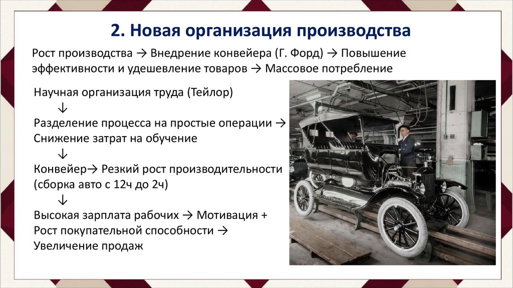 2. Новая организация производстваРост производства → Внедрение конвейера (Г. Форд) → Повышение