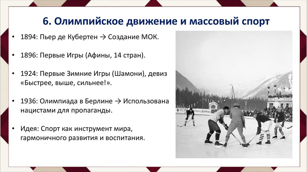 6. Олимпийское движение и массовый спорт• 1894: Пьер де Кубертен → Создание МОК.
