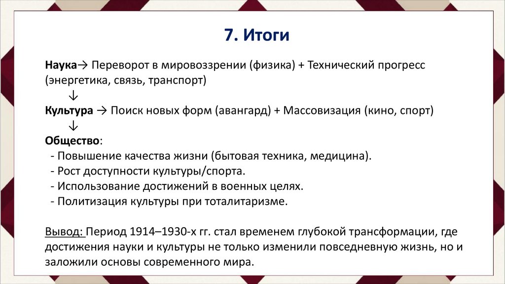 Вывод: Период 1914–1930-х гг. стал временем глубокой трансформации, где