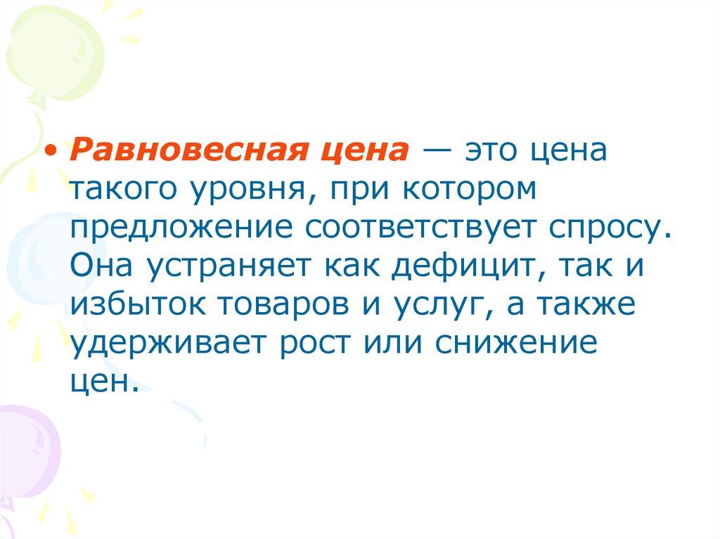 • Равновесная цена — это ценатакого уровня, при котором