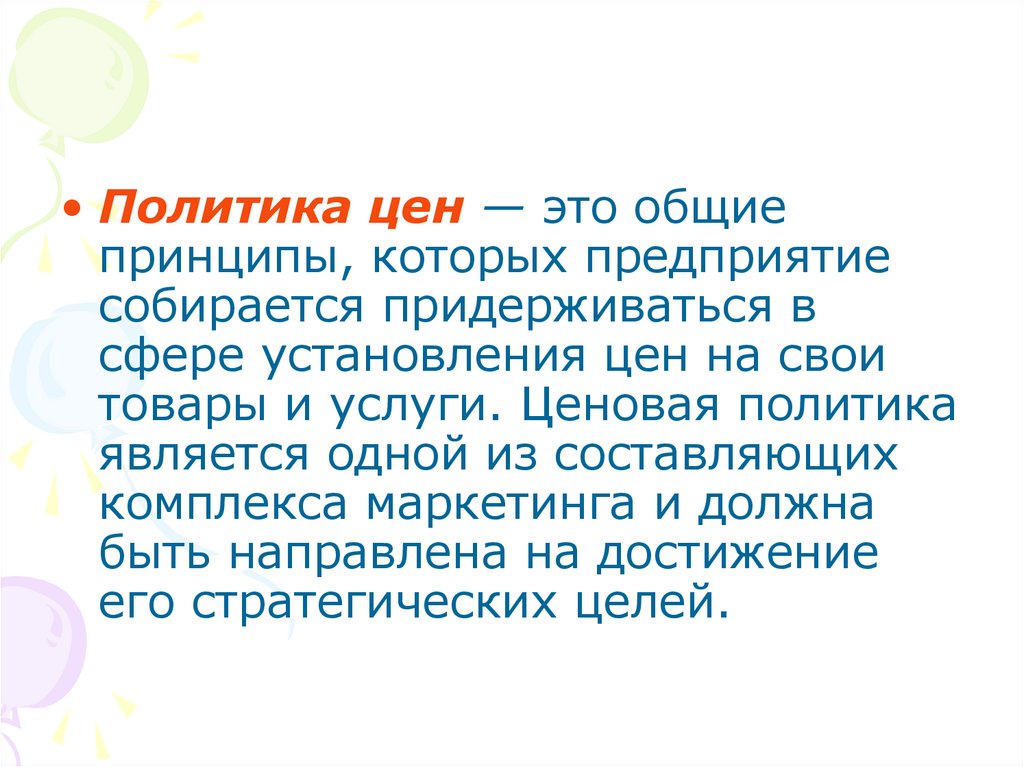 • Политика цен — это общиепринципы, которых предприятие