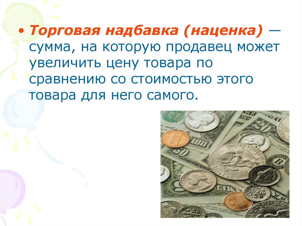 • Торговая надбавка (наценка) —сумма, на которую продавец может