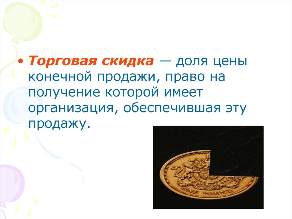 • Торговая скидка — доля ценыконечной продажи, право на