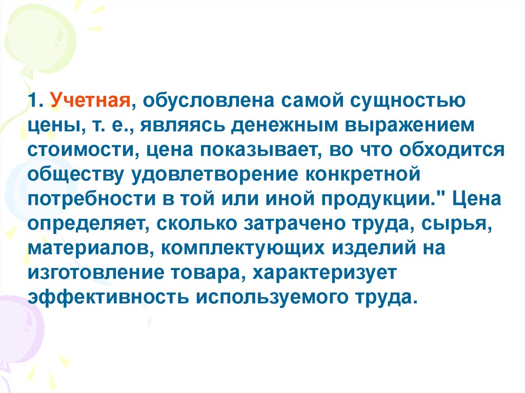 1. Учетная, обусловлена самой сущностьюцены, т. е., являясь денежным выражением