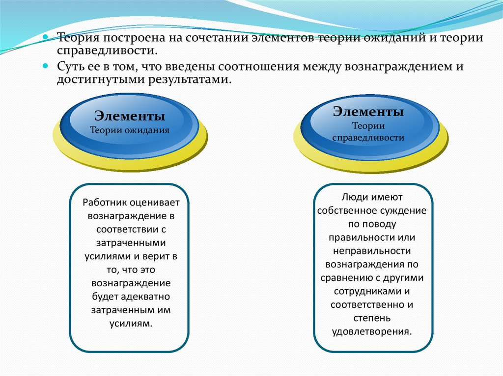 Теория построена на сочетании элементов теории ожиданий и теориисправедливости.