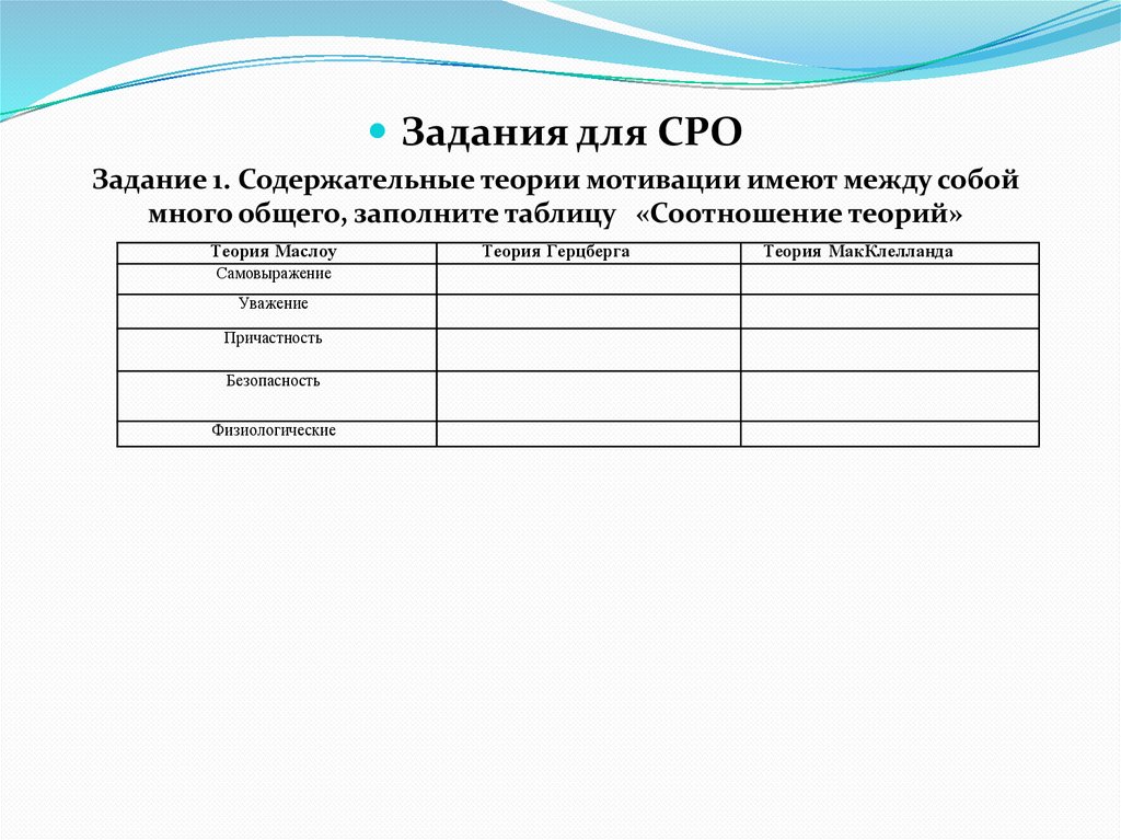 Задания для СРОЗадание 1. Содержательные теории мотивации имеют между собой