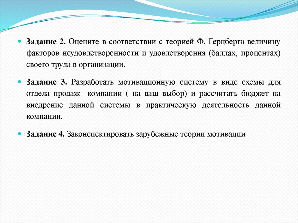 Задание 2. Оцените в соответствии с теорией Ф. Герцберга величинуфакторов неудовлетворенности и удовлетворения (баллах, процентах)