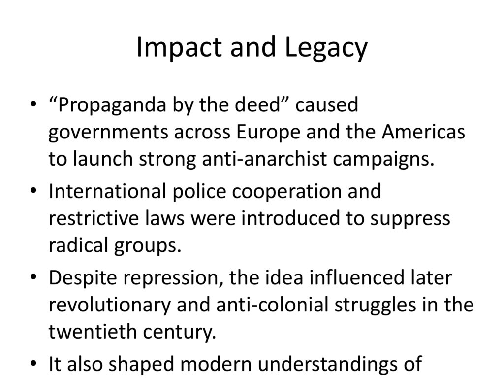 Impact and Legacy• “Propaganda by the deed” caused