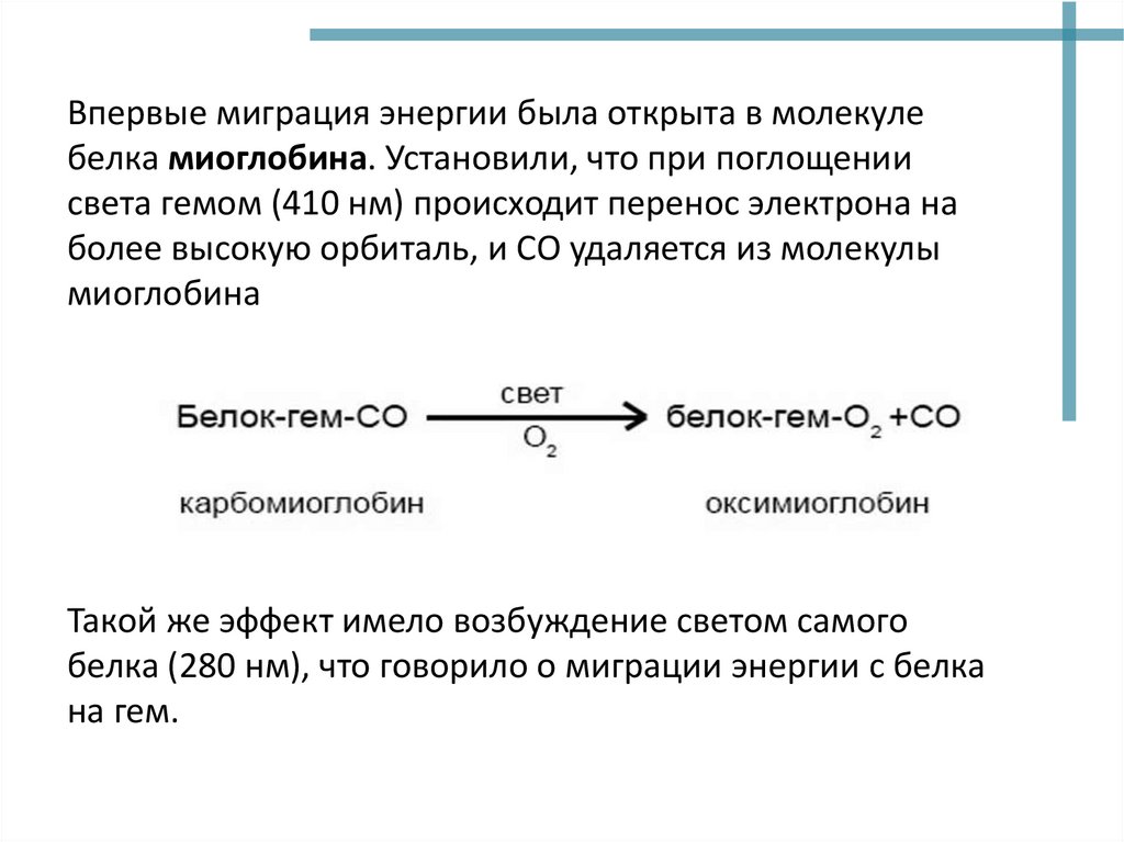 Впервые миграция энергии была открыта в молекулебелка миоглобина. Установили, что при поглощении