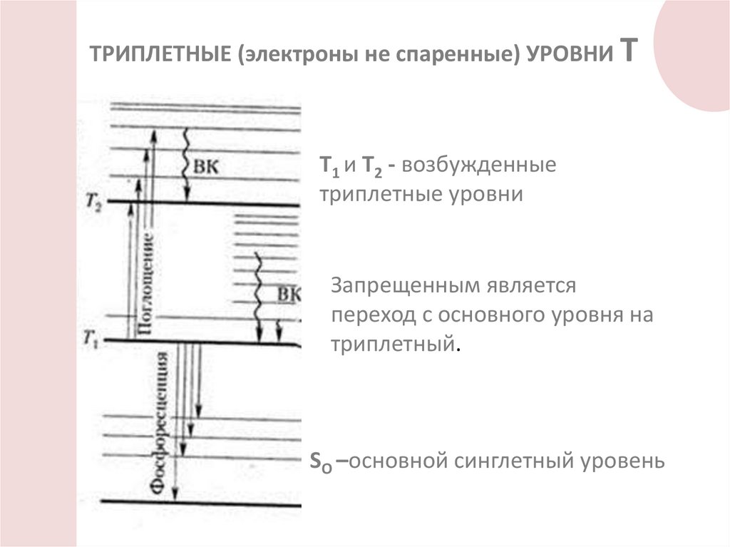 ТРИПЛЕТНЫЕ (электроны не спаренные) УРОВНИ ТТ1 и Т2 - возбужденные