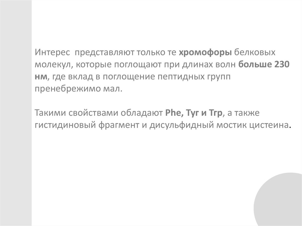Интерес представляют только те хромофоры белковыхмолекул, которые поглощают при длинах волн больше 230