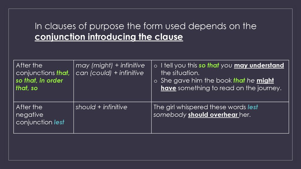 16. The choice of the form is determined by the lexical meaning of the words these clauses follow or refer to: