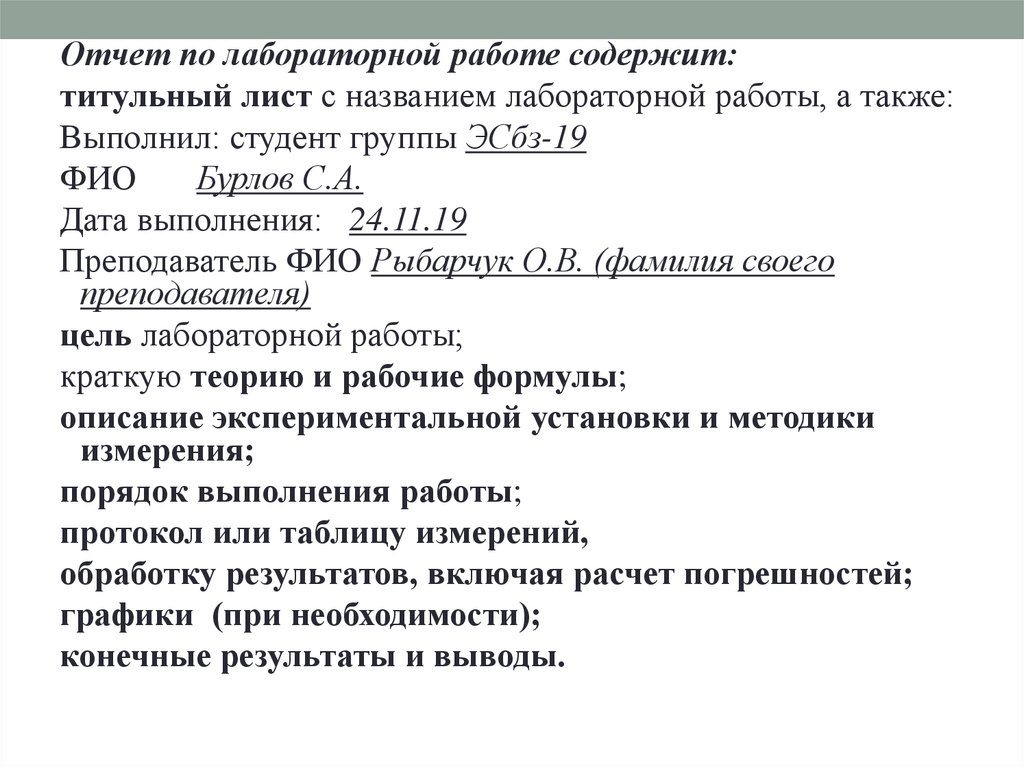 Отчет по лабораторной работе содержит:титульный лист с названием лабораторной работы, а также: