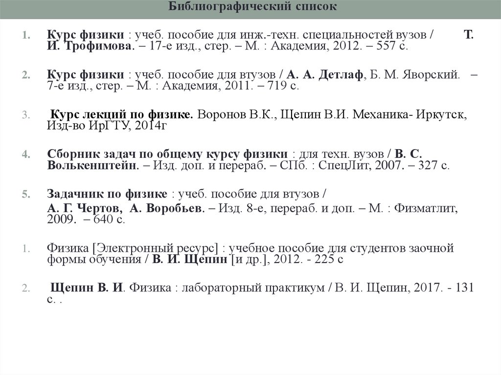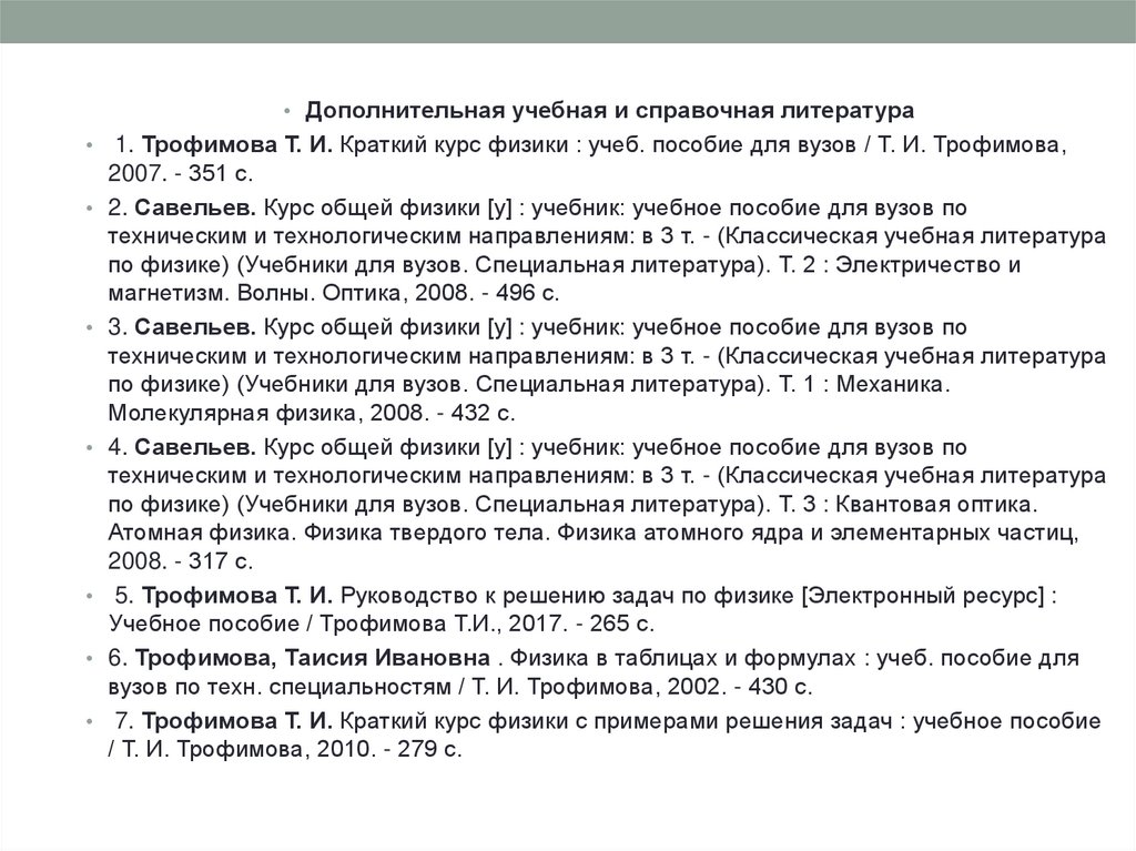 • Дополнительная учебная и справочная литература1. Трофимова Т. И. Краткий курс физики : учеб. пособие для вузов / Т. И. Трофимова,