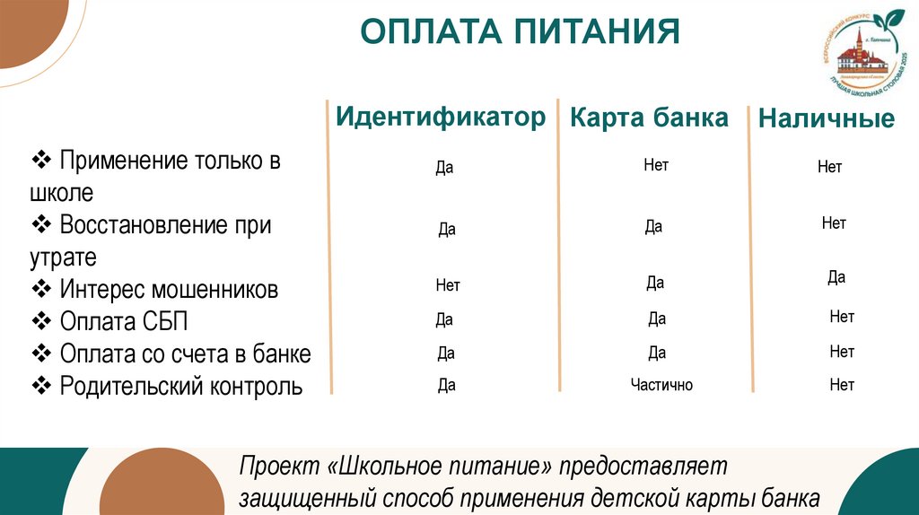ОПЛАТА ПИТАНИЯИдентификатор Карта банка