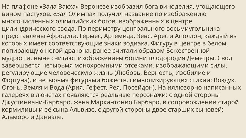 завершил только в 1570 году. В тот же период, во время перерыва в работе над росписями в церкви СанСебастьяно, он сотрудничал с архитектором Андреа Палладио (1508–1580) в оформлении виллы Барбаро
