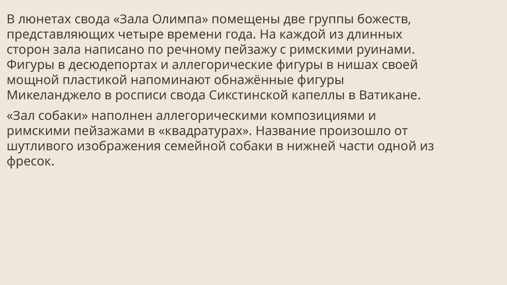 В люнетах свода «Зала Олимпа» помещены две группы божеств,представляющих четыре времени года. На каждой из длинных