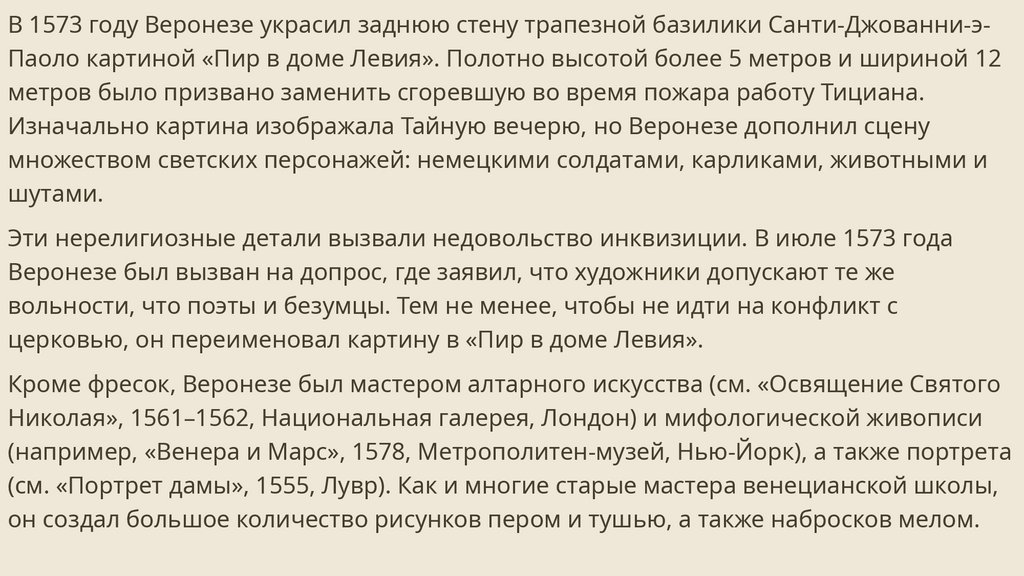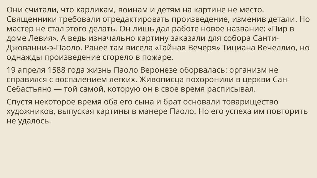 доме Левия». А ведь изначально картину заказали для собора СантиДжованни-э-Паоло. Ранее там висела «Тайная Вечеря» Тициана Вечеллио, но
