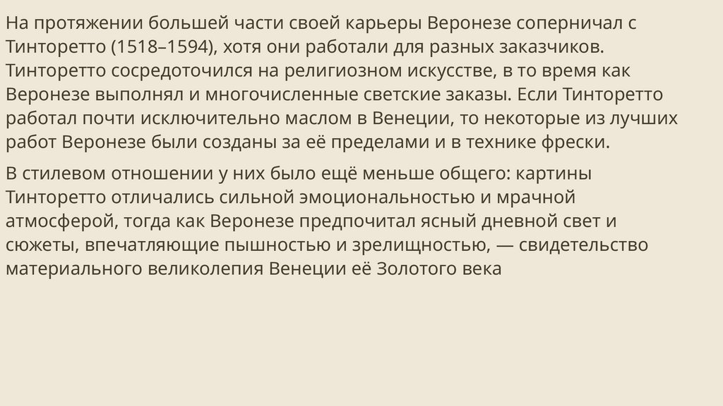 На протяжении большей части своей карьеры Веронезе соперничал сТинторетто (1518–1594), хотя они работали для разных заказчиков.