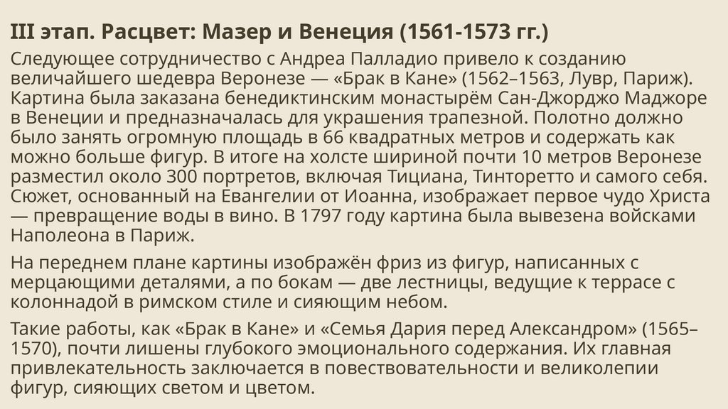 величайшего шедевра Веронезе — «Брак в Кане» (1562–1563, Лувр, Париж).