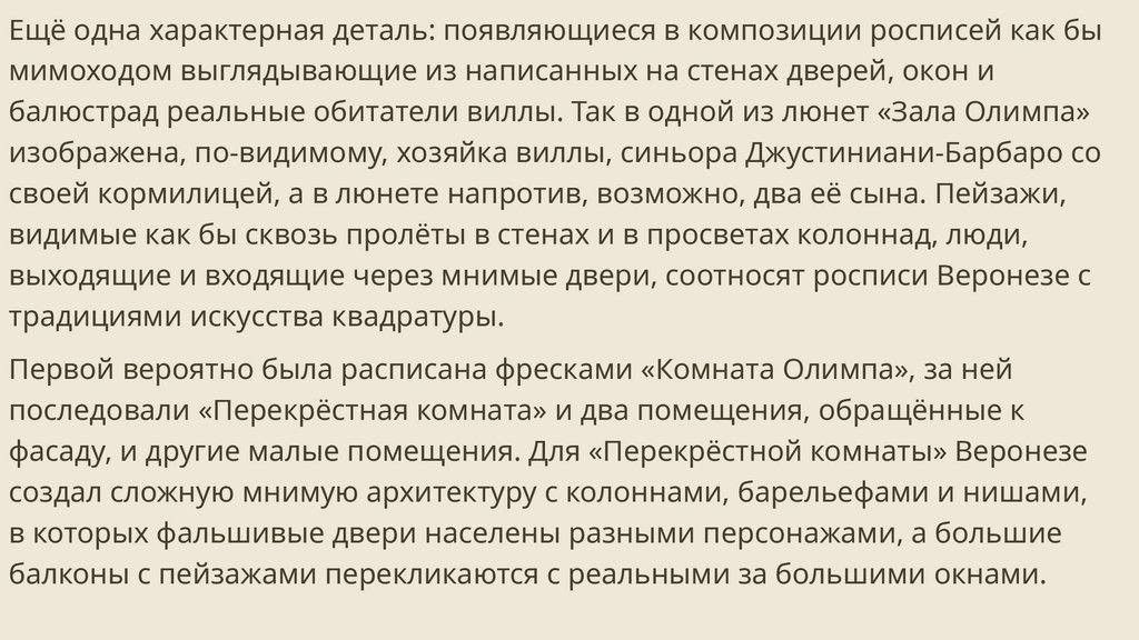 На фресках виллы были изображены портреты семьи Барбаро, а потолки заполнены мифологическими