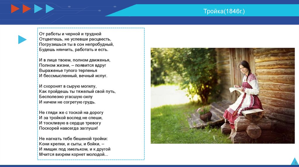 1845 г.; «Тройка», 1846 г.; «Еду ли ночью…» и др.