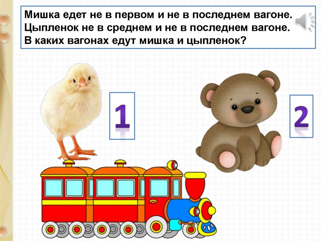 Мишка едет не в первом и не в последнем вагоне.Цыпленок не в среднем и не в последнем вагоне.